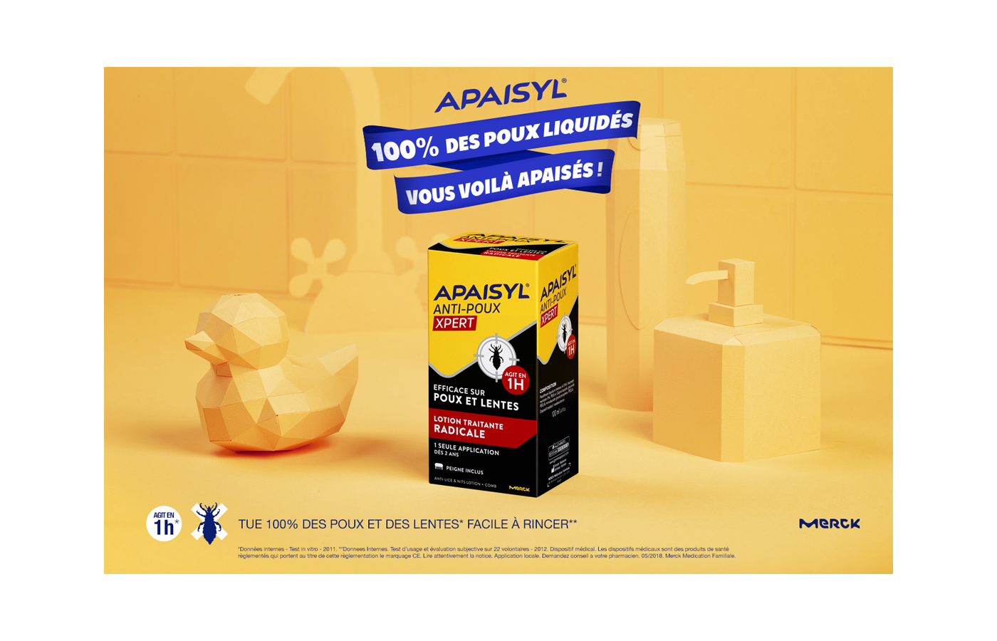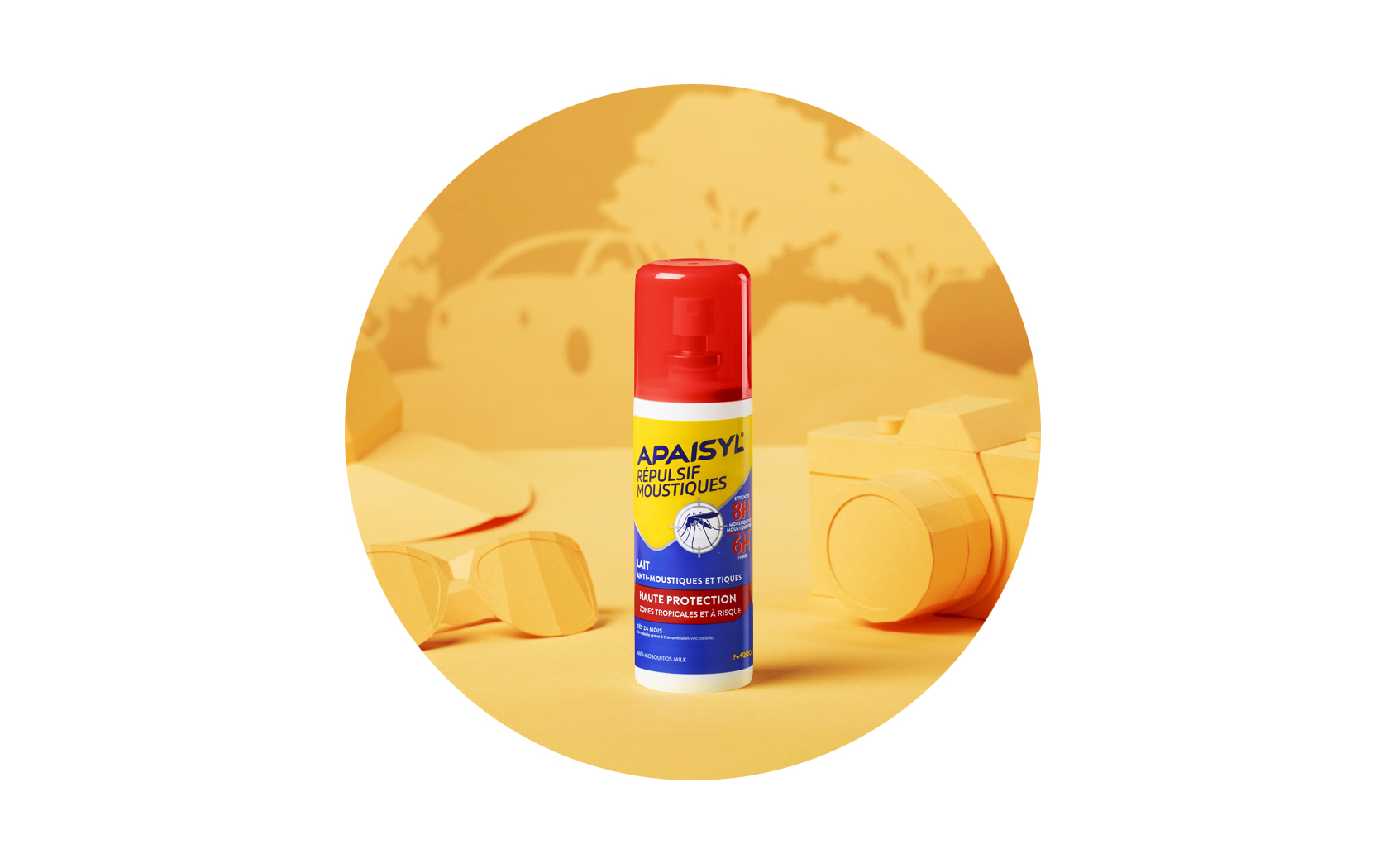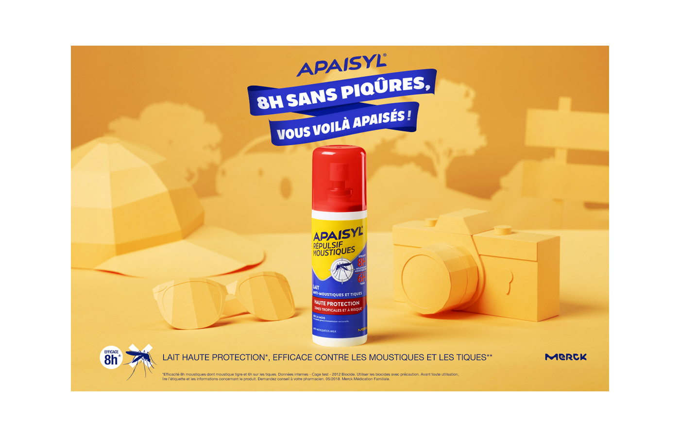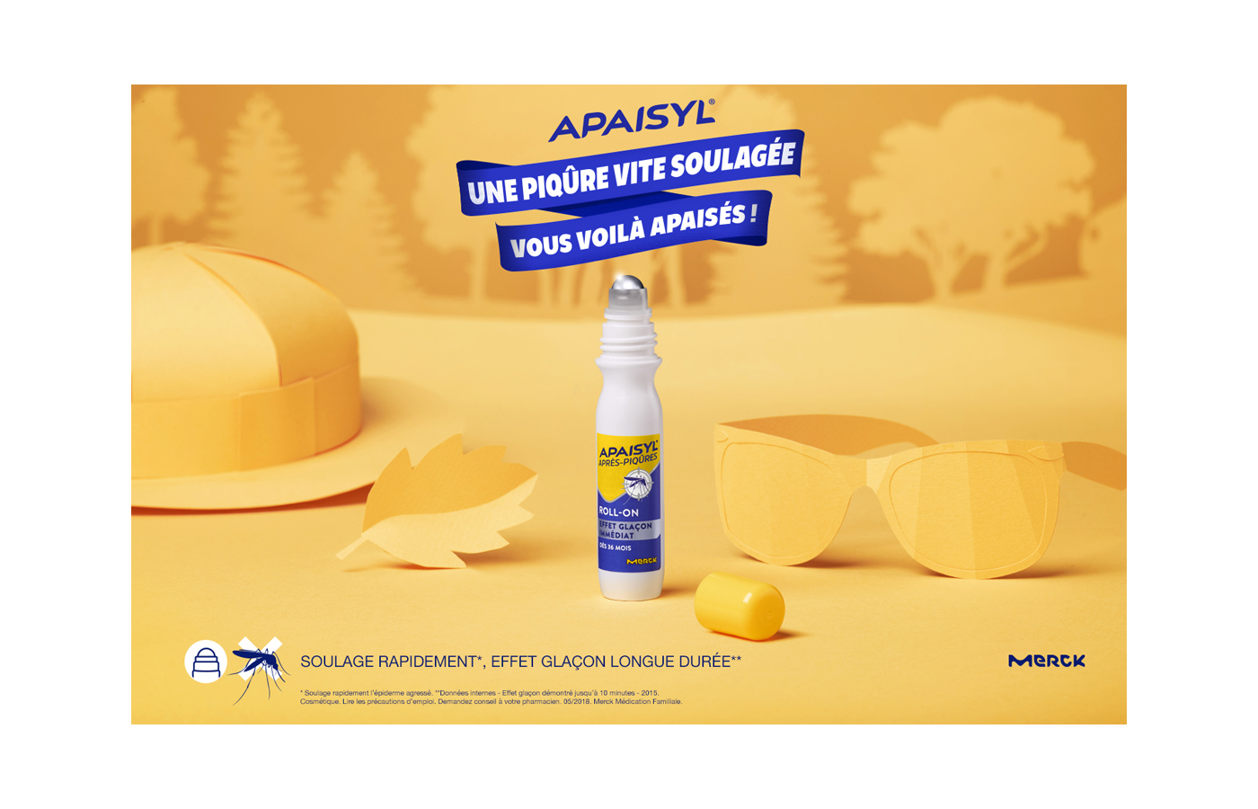 En utilisant un territoire graphique qui lui est propre, Apaisyl marque sa différence avec les autres marques et propose une vision plus poétique de l’utilisation de sa gamme. Le paper craft permet de suggérer des scènes qui donnent un contexte affectif au produit. Le traitement en all over de la couleur jaune favorise une lecture qui met en valeur le pack et l’accroche tout en imposant la couleur de la marque.