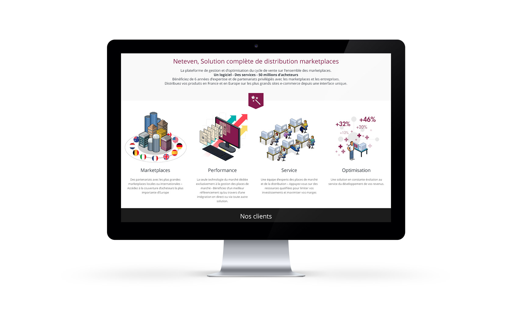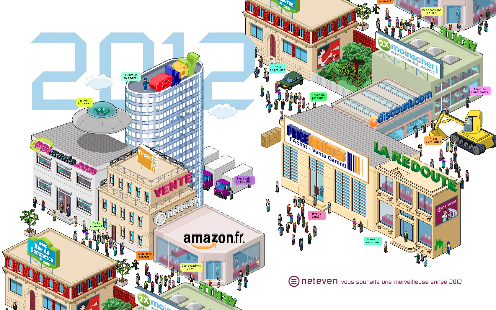 NETEVEN est une société proposant une plateforme de gestion et d’optimisation du cycle de vente sur l’ensemble des marketplaces. L’ensemble de la communication est illustré avec du pixelart pour adopter un ton ludique et donner une personnalité forte à chaque document. Le pixelart permet d’avoir une approche schématique pédagogique pour expliquer les services, ou juste une vocation ludique pour rendre le message plus convivial.